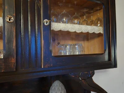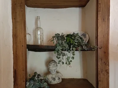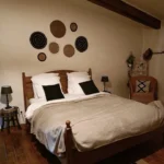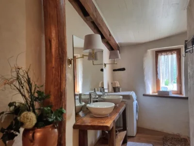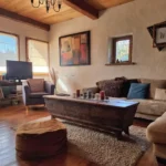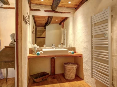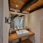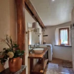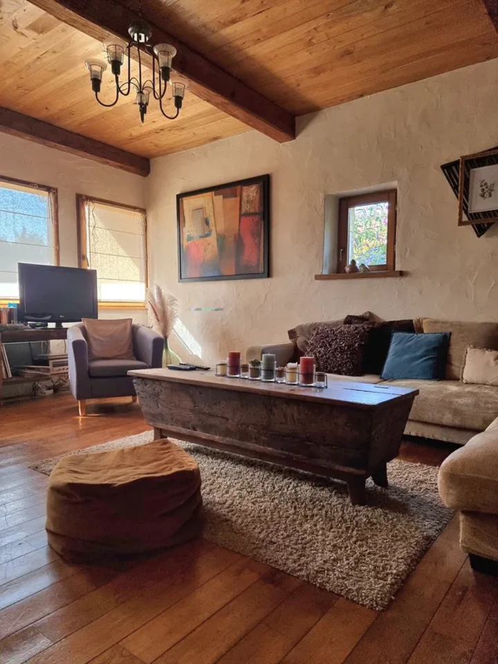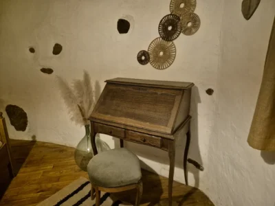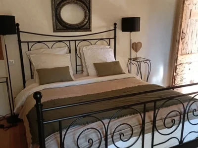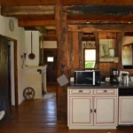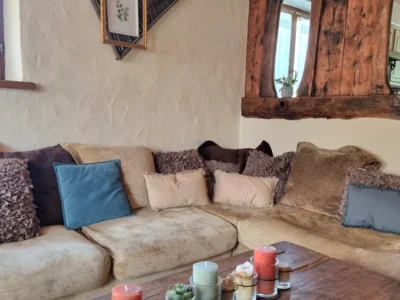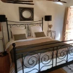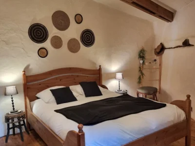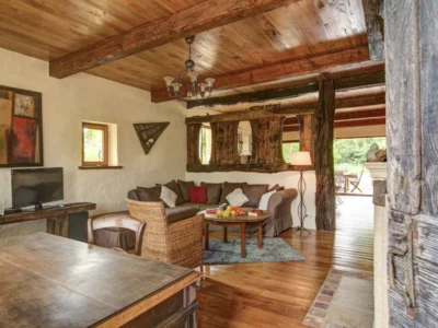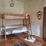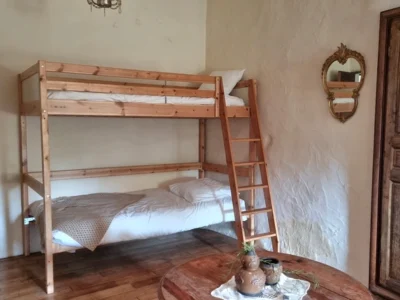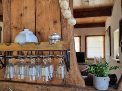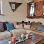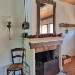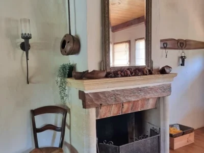 A l’intérieur, l’ambiance est douce et accueillante. Le salon, avec ses poutres apparentes et sa cheminée en pierre, est un refuge parfait pour les soirées fraîches. La décoration mêle objets anciens, matières naturelles et mobilier chaleureux.