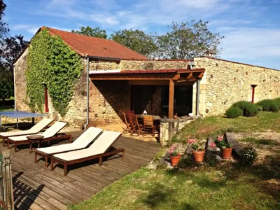 La terrasse en bois et le jardin arboré de ce gîte à la campagne en Dordogne offrent un cadre idéal pour se détendre. Profiter des repas en plein air, d’un barbecue en pierre et d’une vue dégagée sur les champs. Vous pourrez savourer les produits locaux achetés au marché des environs et admirer la vue sur la piscine privée tout en profitant de la quiétude que procurent les champs environnants.