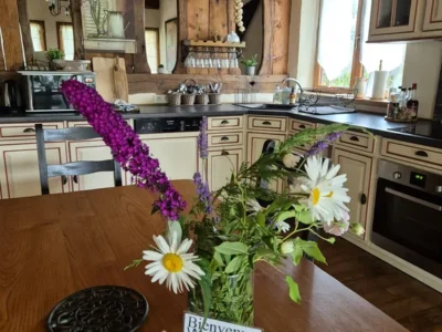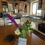 La cuisine rustique entièrement équipée, allie éléments traditionnels et équipements modernes. Une grande table en bois de ferme rassemble petits et grands pour des repas conviviaux.